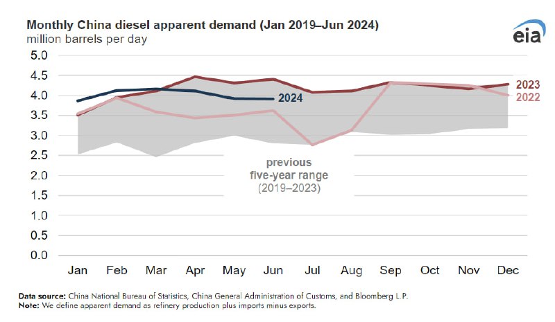 Все перевозки, строительство, сельское хозяйство — всё это в основном работает на дизельном топливе. Даже многие электрические устройства заряжаются с его помощью. Итак, потребление дизельного топлива в летние месяцы снизилось почти на 11% по сравнению с прошлым годом. Напомним, в 2023 году был достигнут абсолютный рекорд.