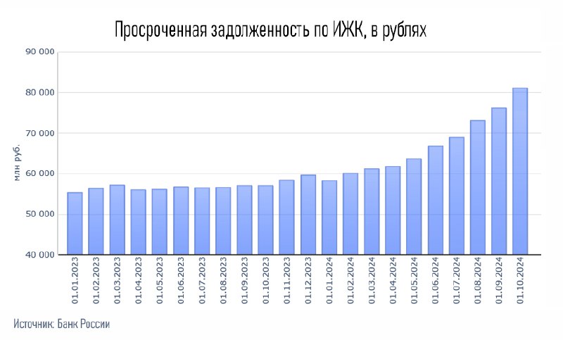 С начала 2024 года просроченная задолженность по ИЖК (ипотечному жилищному кредитованию) в России выросла почти на 40% — с ₽58 млрд (на 01.01.24) до ₽81 млрд (на 01.10.24). Лидирует Москва и МО.