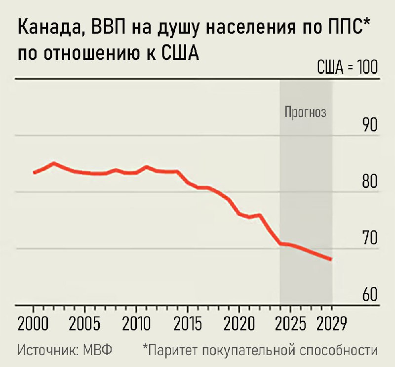 Отстаёт она, так как не суверенна и не может полностью отстаивать свои интересы на максимально выгодных для неё условиях. И при прочих равных, ей выгодней идти на тотальные уступки США, чем получать майданы и СВО на своей территории. Лучше уж оставаться Канадой, чем стать Мексикой.