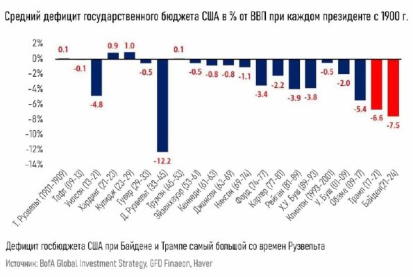 Средний дефицит бюджета США к ВВП при каждом президенте, начиная с 1900 года На Обаму, Трампа и Байдена пришлись рекордные цифры последних лет, почти за всё время, хех.