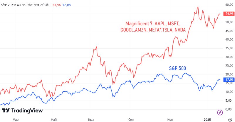 Во многом такие впечатляющие результаты S&P 500 связаны с семью гигантами рынка — Magnificent 7. «Великолепная семёрка» включает: Apple, Microsoft, Alphabet (Google), Amazon, Meta (запрещённая на территории РФ организация), Tesla и Nvidia. Их огромные рыночные капитализации и уверенный рост задают тон всему рынку.