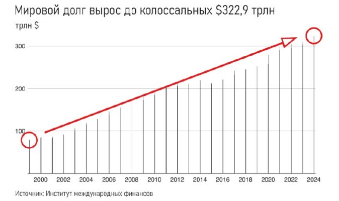 2024 год в 10 графиках Часть 3. Мировой долг взлетел до небес За первые три квартала 2024 года мировой долг вырос более чем на $12 трлн, достигнув рекордной отметки в $322,9 трлн.