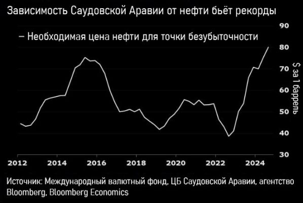 Зависимость Саудовской Аравии от нефти бьет рекорды Саудовской Аравии при текущем уровне добычи необходима цена на нефть выше $80 за баррель, чтобы сбалансировать бюджет и внешние счета, компенсировать