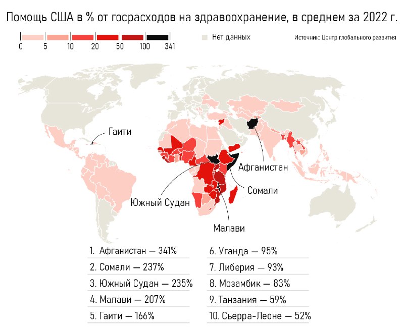 В 37 странах помощь от США составляет 10% государственных расходов на здравоохранение, а в 10 из них — более половины.