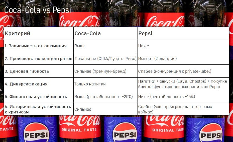 Pepsi исторически хуже Coca-Cola справлялась с торговыми конфликтами, что ставит её в менее выгодное положение в текущей ситуации с тарифами.