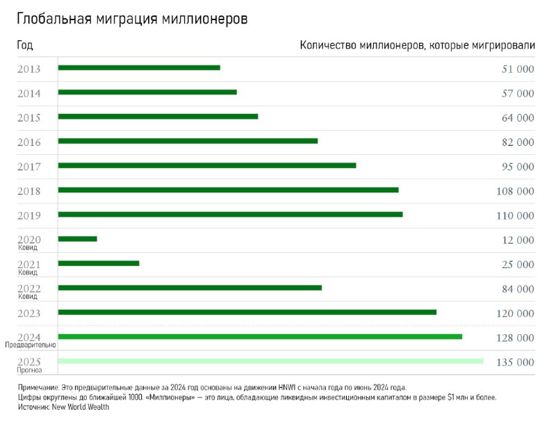 Согласно прогнозам Henley&Partners, в 2024 году ожидается рекордная миграция миллионеров — более 128 000 человек. Среди лидеров по оттоку: Китай (15 200) — плохая экология и стремление обеспечить детям доступ к лучшему образованию и медицине, и Великобритания (9 500) — высокие налоги и последствия Brexit.