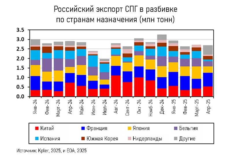 Франция отличается устойчивым спросом, в то время как Китай сохраняет стабильные позиции с незначительными изменениями (у него по плану в 2025 году импортировать больше СПГ из РФ).