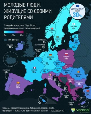 Евростат: каждый третий европеец от 25 до 34 лет живёт с родителями Согласно свежим данным, около 30% молодых людей в Европе продолжают жить в родительском доме из-за высоких цен на жильё, нестабильного
