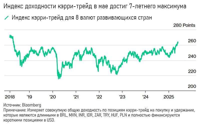 Напомним, кэрри-трейд — стратегия, при которой инвесторы занимают средства в валютах с низкими процентными ставками (например, в японской иене, евро, швейцарском франке) и вкладывают их в высокодоходные активы в развивающихся странах (например, в мексиканское песо, бразильский реал, турецкую лиру).