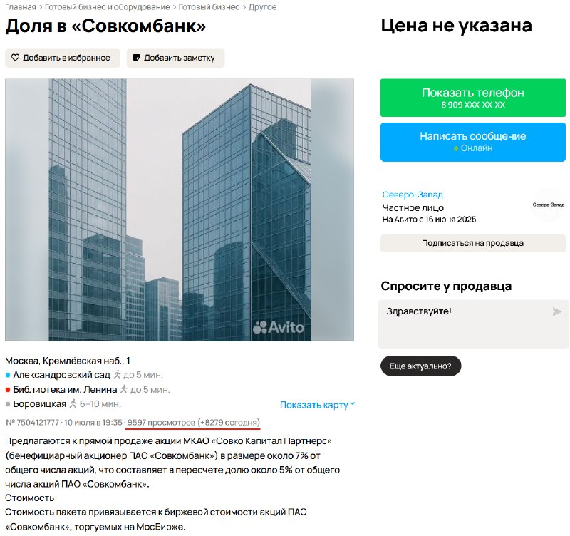 Михаил Клюкин (российский бизнесмен, финансист, инвестор) выставил на продажу свою долю в Совкомбанке на Авито. Это примерно 7% акций МКАО «Совко Капитал Партнерс» (бенефициарный акционер ПАО «Совкомбанк»), что эквивалентно 5% акций банка.