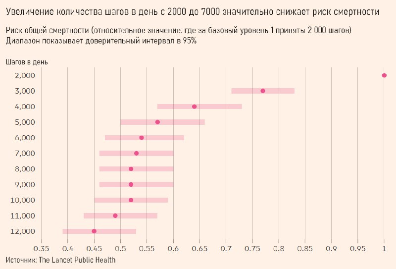Анализ данных более 160 000 взрослых показал, что прохождение 7 000 шагов в день снижает общую смертность на 47% по сравнению с теми, кто делает лишь 2 000 шагов.