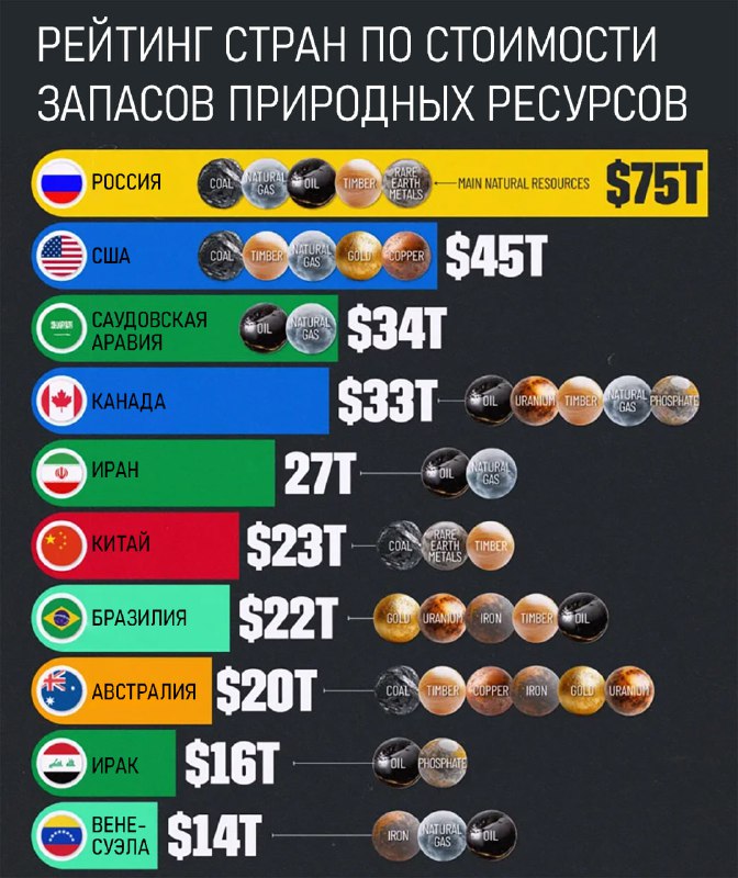 1️⃣ Россия №1 по запасам природных ресурсов, общая стоимость которых оценивается в $75 трлн, включая уголь, газ, нефть, золото, древесину и редкоземельные металлы.