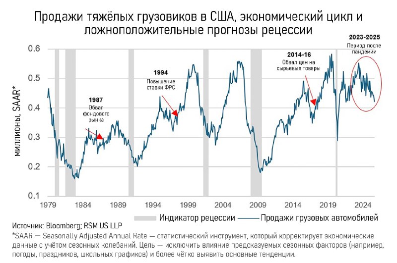 В США падают продажи тяжёлых грузовиков, что исторически почти всегда предвещало рецессию (график сверху).