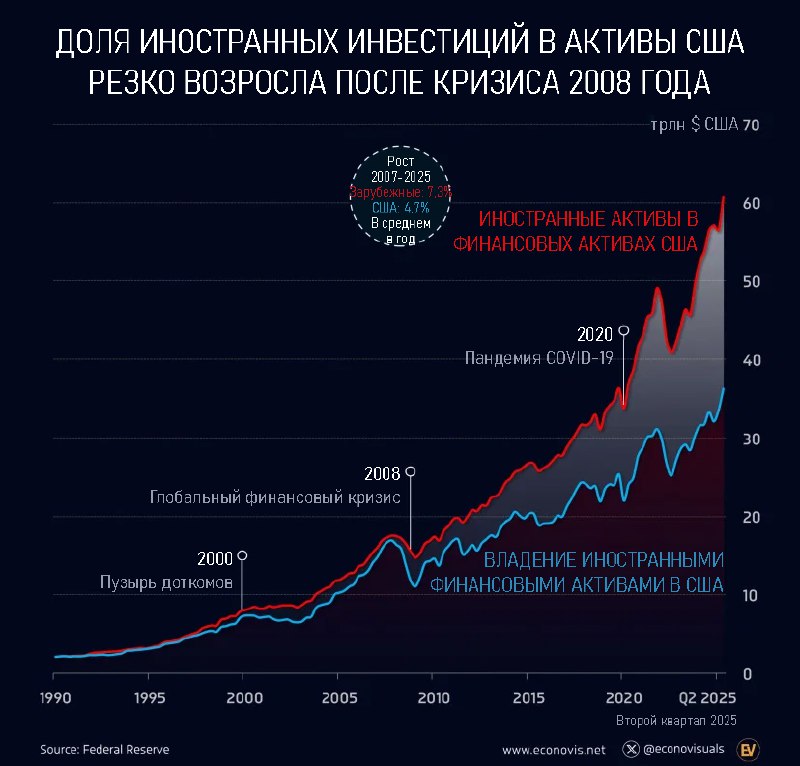 С 2007 по 2025 год объём иностранных активов в США вырос более чем в 3 раза: с $17 трлн до $60,6 трлн (средний прирост — 7,3% в год).