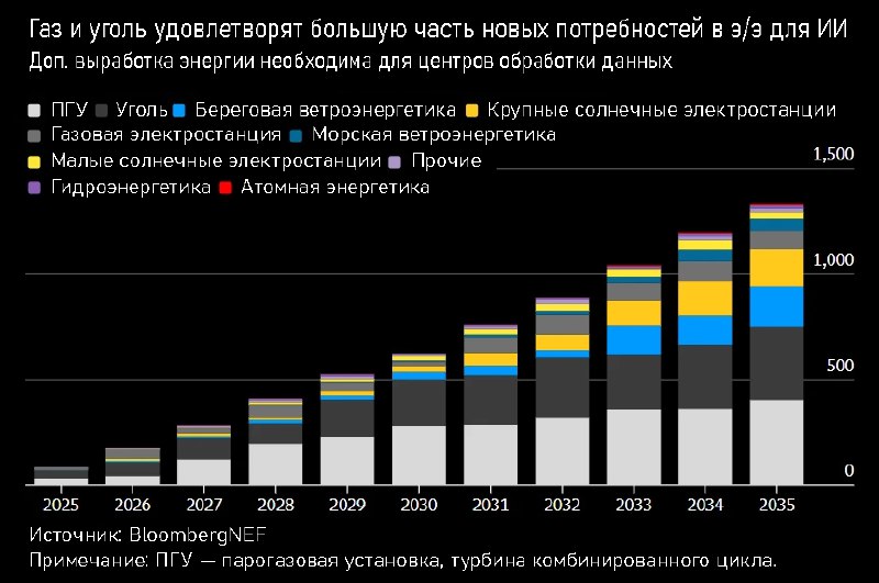 По оценкам аналитиков, к 2035 году газовые и угольные электростанции будут обеспечивать более половины прироста мировой генерации, необходимой для питания ИИ.