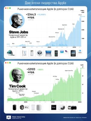 Две эпохи Apple: Джобс и Кук Под руководством двух разных лидеров Apple достигла выдающихся результатов, хотя их подходы к управлению и инновациям существенно различались.