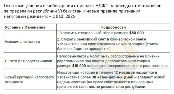 Узбекистан освободит иностранцев от НДФЛ С 1 января 2026 года в Узбекистане вводится специальный налоговый режим для иностранных граждан, предусматривающий освобождение от уплаты НДФЛ на доходы от источников за пределами республики.