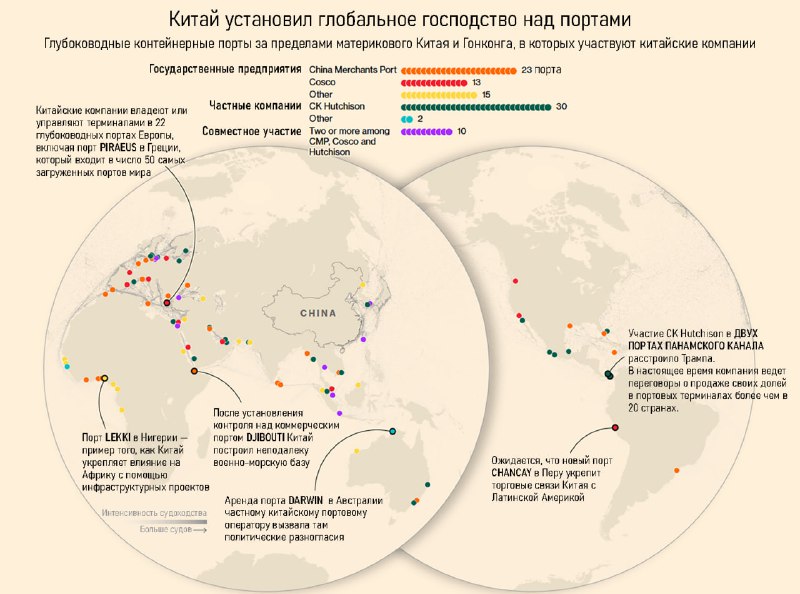 Китайские госкомпании и аффилированные структуры имеют доли, концессии, управление или фактический контроль в более чем 90 глубоководных зарубежных портах. Это почти половина от всех глубоководных портов мира. Причём 34 из 100 — самые загруженные по рейтингу Lloyd’s List.