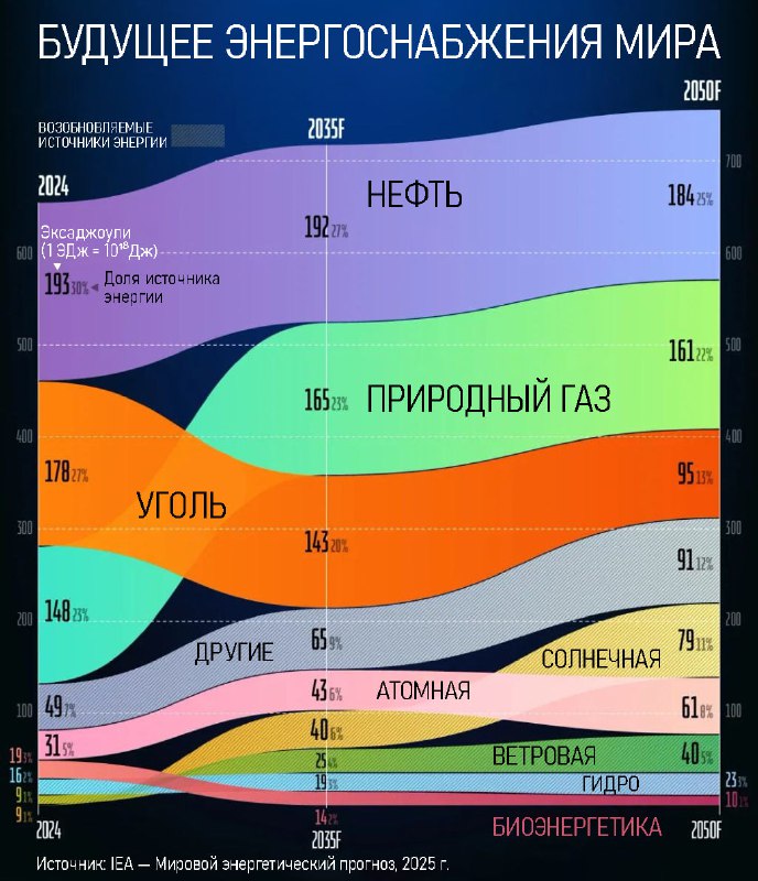 График показывает, что возобновляемые источники энергии (привет, зелёная повесточка) к 2050 году составят ~31% от всего объёма (х2,3 с 2024), хотя ранее планировался чуть ли полный переход (чем подобное может закончится писали тут).