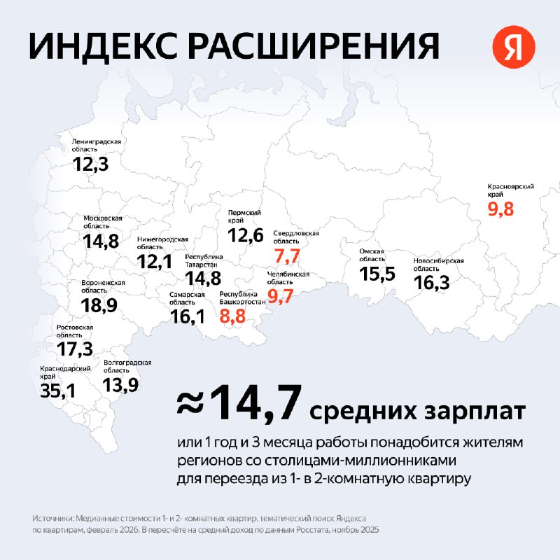 Методика простая: берут разницу медианных цен квартир и делят на среднюю зарплату по данным Росстата.