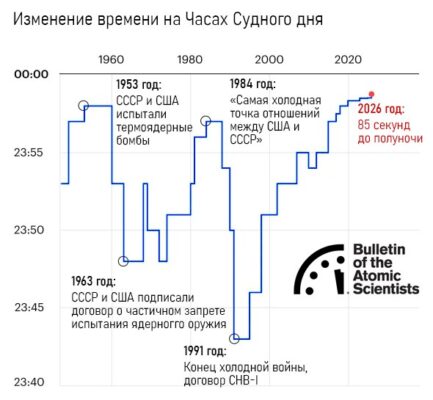 Стрелки Часов Судного дня перевели на отметку 85 секунд до «ядерной полуночи» Прибавив к прошлогоднему значению 4 секунды. Решение объясняют ростом ядерных рисков, военных конфликтов и общей нестабильности в мире.